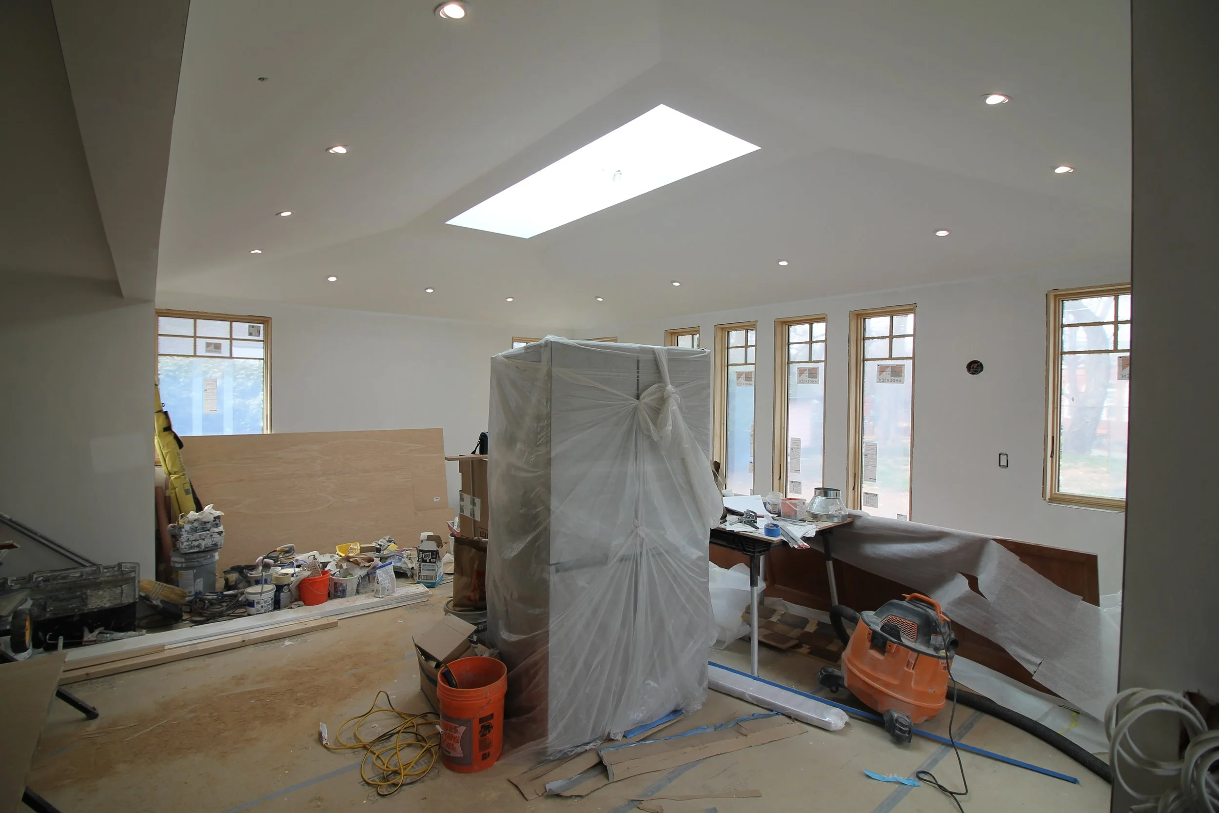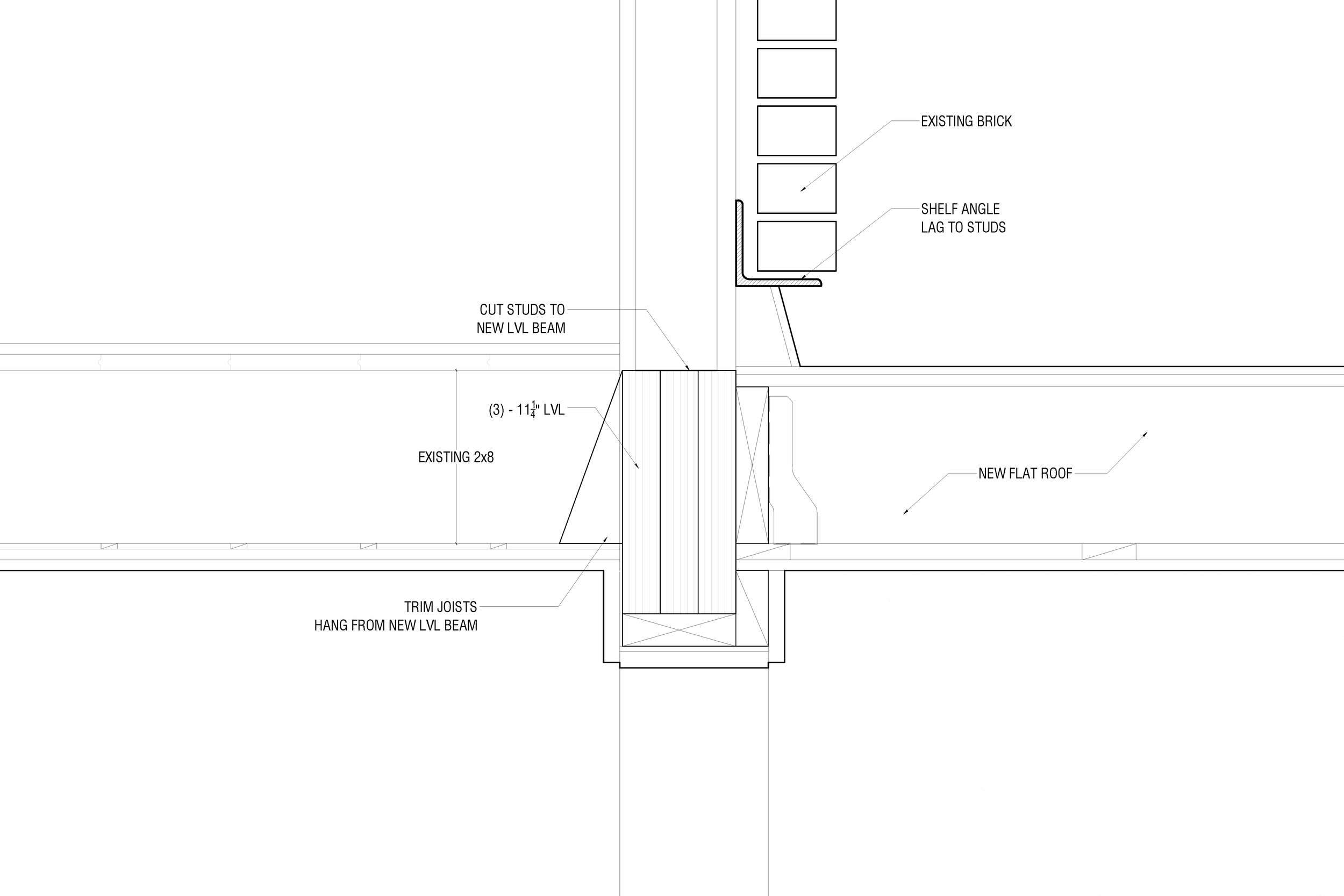 Diagram of new LVL beam, flat joining roof, and ceiling matching conditions of existing home.