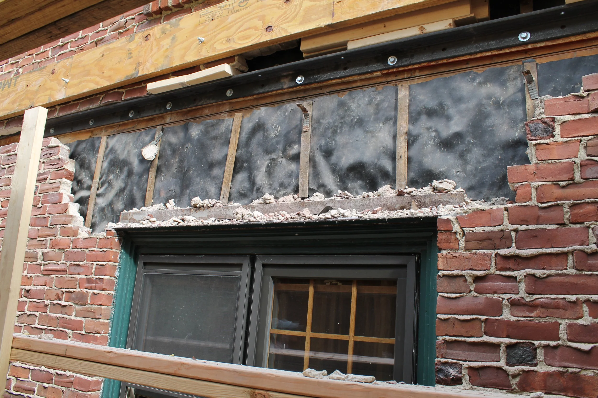 Historic clinker brick facade cleared to support new opening and LVL beam.